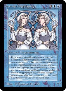 You may have Vesuvan Doppelganger enter the battlefield as a copy of any creature on the battlefield except it doesn't copy that creature's color and it gains "At the beginning of your upkeep, you may have this creature become a copy of target creature except it doesn't copy that creature's color. If you do, this creature gains this ability."