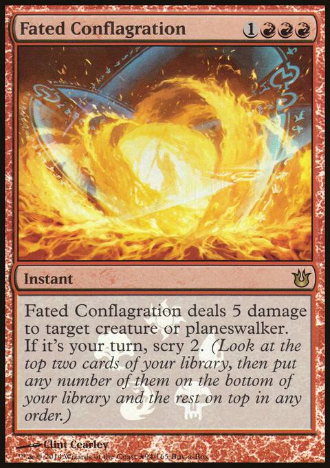 Fated Conflagration deals 5 damage to target creature or planeswalker. If it's your turn, scry 2. (Look at the top two cards of your library, then put any number of them on the bottom of your library and the rest on top in any order.)
