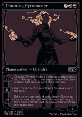 +1: Chandra, Pyromaster deals 1 damage to target player and 1 damage to up to one target creature that player controls. That creature can't block this turn.