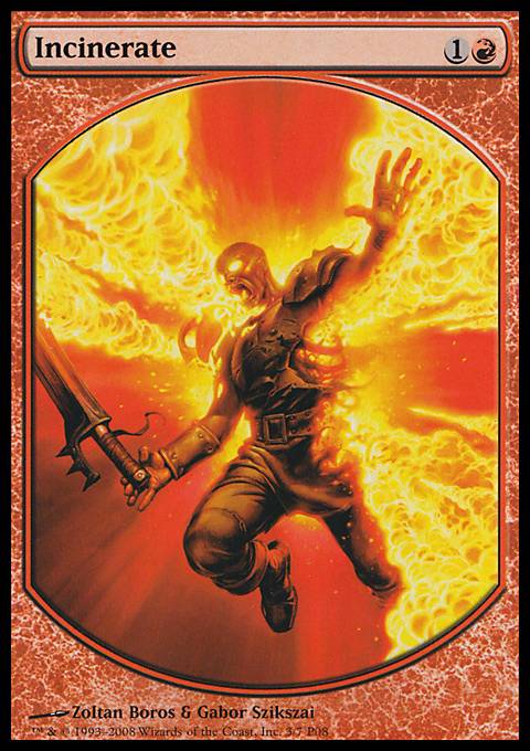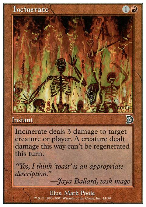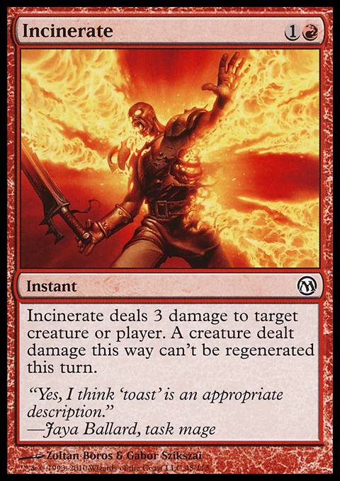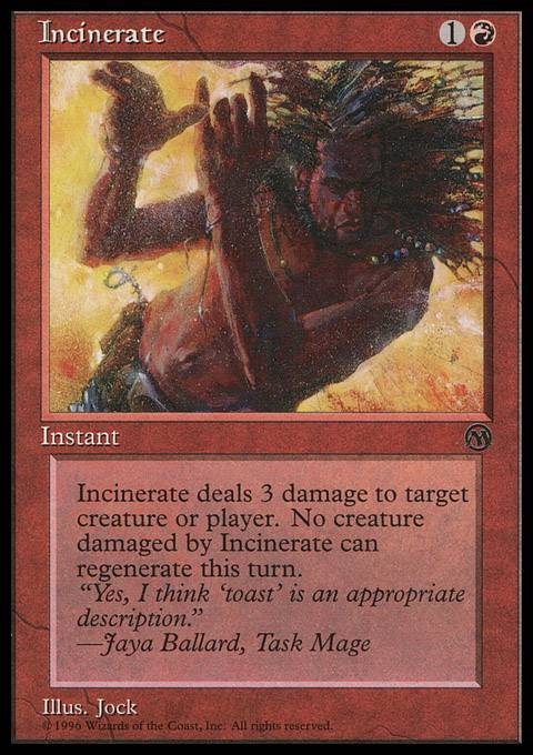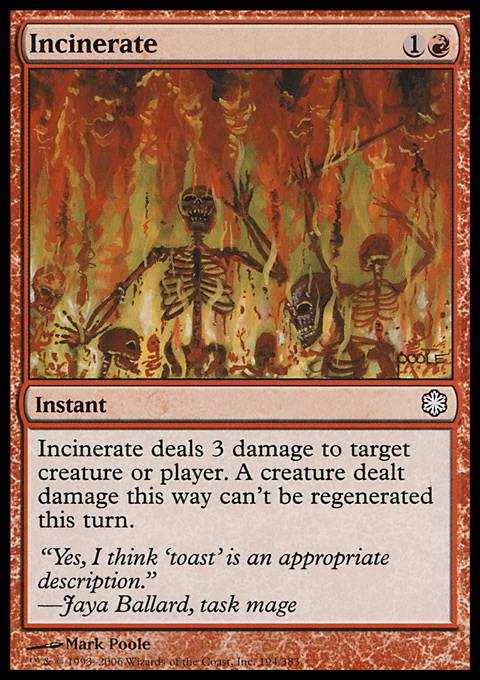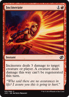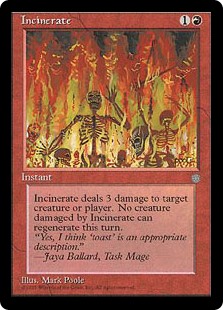 Incinerate deals 3 damage to target creature or player. A creature dealt damage this way can't be regenerated this turn.
