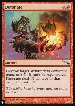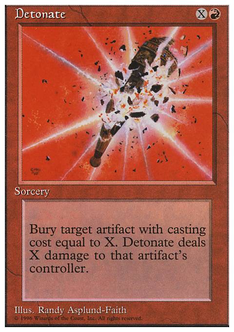 Destroy target artifact with converted mana cost X. It can't be regenerated. Detonate deals X damage to that artifact's controller.
