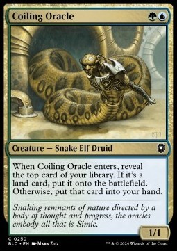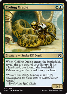 When Coiling Oracle enters the battlefield, reveal the top card of your library. If it's a land card, put it onto the battlefield. Otherwise, put that card into your hand.