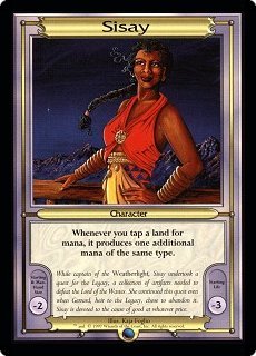 While captain of the Weatherlight, Sisay undertook a quest for the Legacy, a collection of artifacts needed to defeat the Lord of the Wastes. She continued this quest even when Gerrard, heir to the Legacy, chose to abandon it. Sisay is devoted to the cause of good at whatever price.