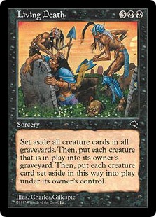 Each player exiles all creature cards from his or her graveyard, then sacrifices all creatures he or she controls, then puts all cards he or she exiled this way onto the battlefield.