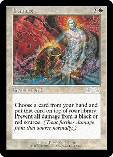 Put a card from your hand on top of your library: The next time a black or red source of your choice would deal damage this turn, prevent that damage.