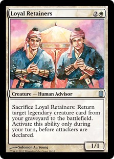 Sacrifice Loyal Retainers: Return target legendary creature card from your graveyard to the battlefield. Activate this ability only during your turn, before attackers are declared.