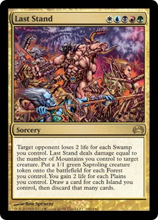 Target opponent loses 2 life for each Swamp you control. Last Stand deals damage equal to the number of Mountains you control to target creature. Put a 1/1 green Saproling creature token onto the battlefield for each Forest you control. You gain 2 life for each Plains you control. Draw a card for each Island you control, then discard that many cards.