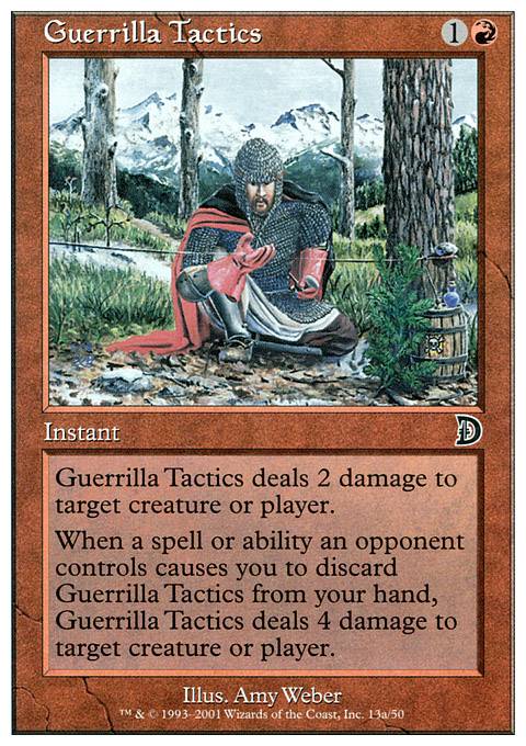 When a spell or ability an opponent controls causes you to discard Guerrilla Tactics, Guerrilla Tactics deals 4 damage to target creature or player.
