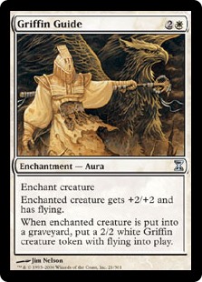 When enchanted creature dies, put a 2/2 white Griffin creature token with flying onto the battlefield.