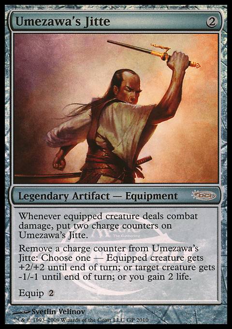 Whenever equipped creature deals combat damage, put two charge counters on Umezawa's Jitte.