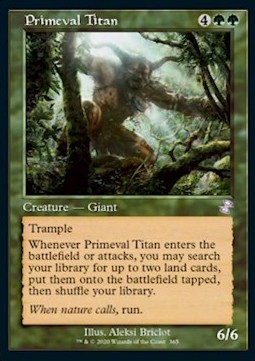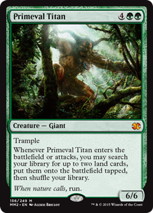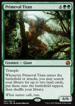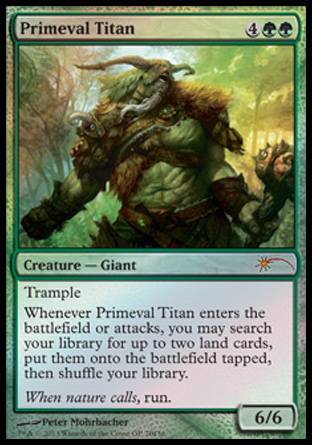 Whenever Primeval Titan enters the battlefield or attacks, you may search your library for up to two land cards, put them onto the battlefield tapped, then shuffle your library.