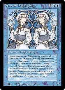 You may have Vesuvan Doppelganger enter the battlefield as a copy of any creature on the battlefield except it doesn't copy that creature's color and it gains "At the beginning of your upkeep, you may have this creature become a copy of target creature except it doesn't copy that creature's color. If you do, this creature gains this ability."