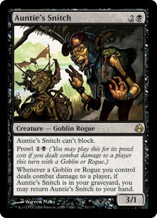 Whenever a Goblin or Rogue you control deals combat damage to a player, if Auntie's Snitch is in your graveyard, you may return Auntie's Snitch to your hand.