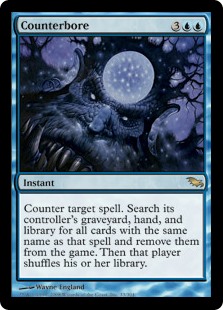 Counter target spell. Search its controller's graveyard, hand, and library for all cards with the same name as that spell and exile them. Then that player shuffles his or her library.