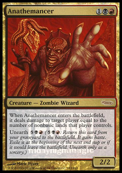 When Anathemancer enters the battlefield, it deals damage to target player equal to the number of nonbasic lands that player controls.