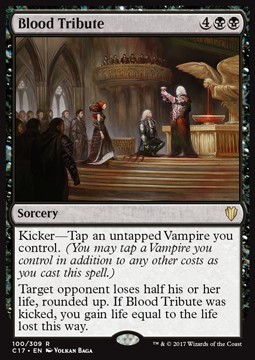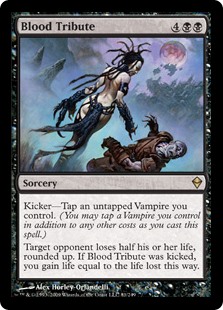 Target opponent loses half his or her life, rounded up. If Blood Tribute was kicked, you gain life equal to the life lost this way.