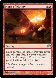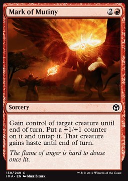 Gain control of target creature until end of turn. Put a +1/+1 counter on it and untap it. That creature gains haste until end of turn. (It can attack and