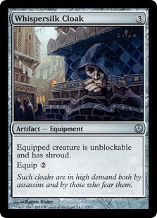 Equipped creature can't be blocked and has shroud. (It can't be the target of spells or abilities.)