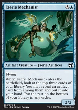 When Faerie Mechanist enters the battlefield, look at the top three cards of your library. You may reveal an artifact card from among them and put it into your hand. Put the rest on the bottom of your library in any order.