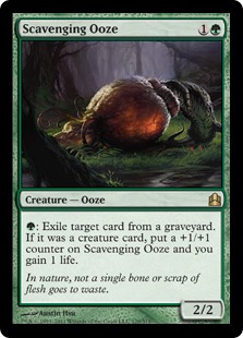 G: Exile target card from a graveyard. If it was a creature card, put a +1/+1 counter on Scavenging Ooze and you gain 1 life.