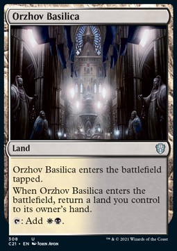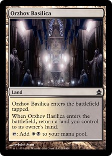 When Orzhov Basilica enters the battlefield, return a land you control to its owner's hand.
