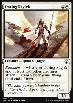 Battalion — Whenever Daring Skyjek and at least two other creatures attack, Daring Skyjek gains flying until end of turn.