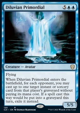 When Diluvian Primordial enters the battlefield, for each opponent, you may cast up to one target instant or sorcery card from that player's graveyard without paying its mana cost. If a card cast this way would be put into a graveyard this turn, exile it instead.