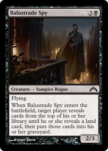 When Balustrade Spy enters the battlefield, target player reveals cards from the top of his or her library until he or she reveals a land card, then puts those cards into his or her graveyard.