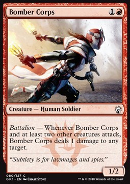 Battalion — Whenever Bomber Corps and at least two other creatures attack, Bomber Corps deals 1 damage to target creature or player.