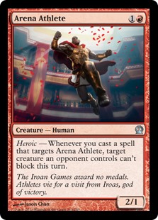 Heroic — Whenever you cast a spell that targets Arena Athlete, target creature an opponent controls can't block this turn.