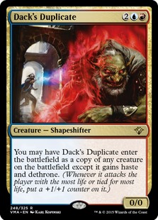 You may have Dack's Duplicate enter the battlefield as a copy of any creature on the battlefield except it gains haste and dethrone. (Whenever it attacks the player with the most life or tied for most life, put a +1/+1 counter on it.)