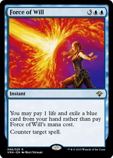 You may pay 1 life and exile a blue card from your hand rather than pay Force of Will's mana cost.