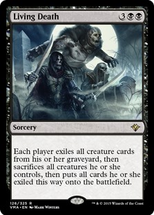 Each player exiles all creature cards from his or her graveyard, then sacrifices all creatures he or she controls, then puts all cards he or she exiled this way onto the battlefield.