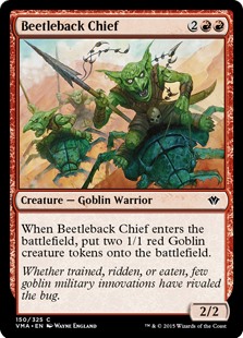 When Beetleback Chief enters the battlefield, put two 1/1 red Goblin creature tokens onto the battlefield.