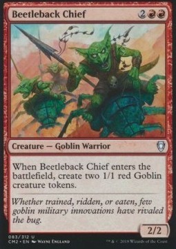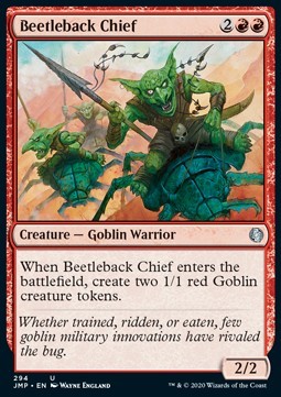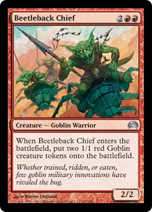 When Beetleback Chief enters the battlefield, put two 1/1 red Goblin creature tokens onto the battlefield.