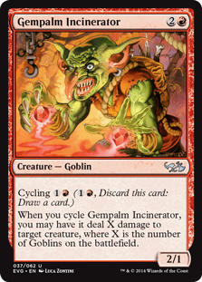 When you cycle Gempalm Incinerator, you may have it deal X damage to target creature, where X is the number of Goblins on the battlefield.