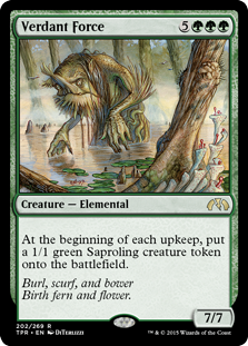 At the beginning of each upkeep, put a 1/1 green Saproling creature token onto the battlefield.