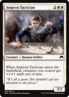 When Ampryn Tactician enters the battlefield, creatures you control get +1/+1 until end of turn.