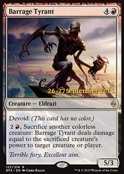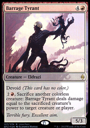 , Sacrifice another colorless creature: Barrage Tyrant deals damage equal to the sacrificed creature's power to target creature or player.