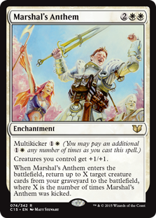 When Marshal's Anthem enters the battlefield, return up to X target creature cards from your graveyard to the battlefield, where X is the number of times Marshal's Anthem was kicked.