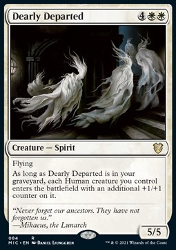 As long as Dearly Departed is in your graveyard, each Human creature you control enters the battlefield with an additional +1/+1 counter on it.