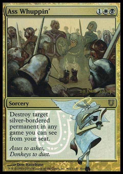 Destroy target silver-bordered permanent in any game you can see from your seat.
