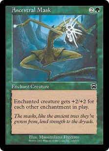 Enchanted creature gets +2/+2 for each other enchantment on the battlefield.