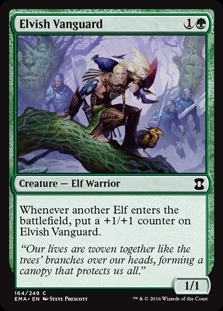 Whenever another Elf enters the battlefield, put a +1/+1 counter on Elvish Vanguard.