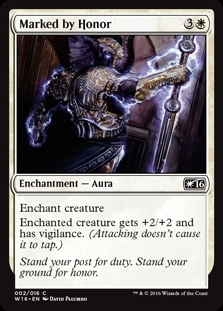 Enchanted creature gets +2/+2 and has vigilance. (Attacking doesn't cause it to tap.)