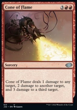 Cone of Flame deals 1 damage to target creature or player, 2 damage to another target creature or player, and 3 damage to a third target creature or player.