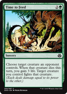Choose target creature an opponent controls. When that creature dies this turn, you gain 3 life. Target creature you control fights that creature. (Each deals damage equal to its power to the other.)