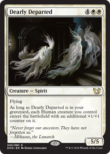 As long as Dearly Departed is in your graveyard, each Human creature you control enters the battlefield with an additional +1/+1 counter on it.