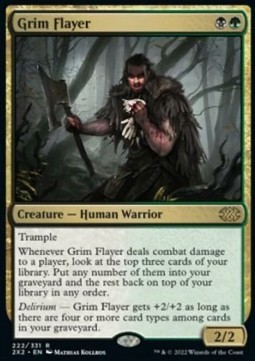 Delirium — Grim Flayer gets +2/+2 as long as there are four or more card types among cards in your graveyard.