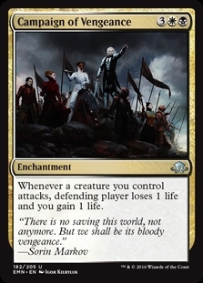 Whenever a creature you control attacks, defending player loses 1 life and you gain 1 life.
